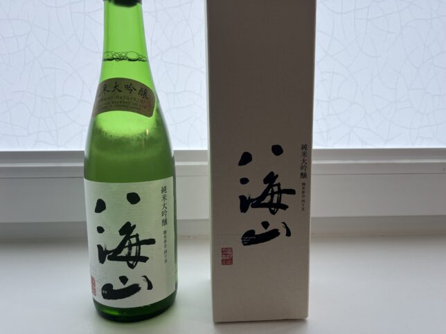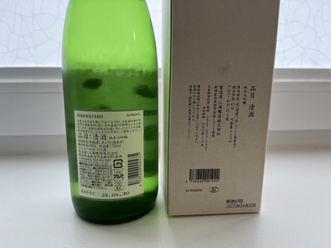 今回は八海山の純米大吟醸をいただきました。日本酒が入っている瓶も清潔感がありいい印象ですが日本酒そのものも透明感があります。飲み口も軽やかでフルーティーな香り、とても飲みやすい日本酒だと思います。ラベルを見ると精米歩合 45%、 アルコール度数15.5% 、日本酒度は書かれてないようですがサイトを見ると+4度と記載されており辛口目のようです。