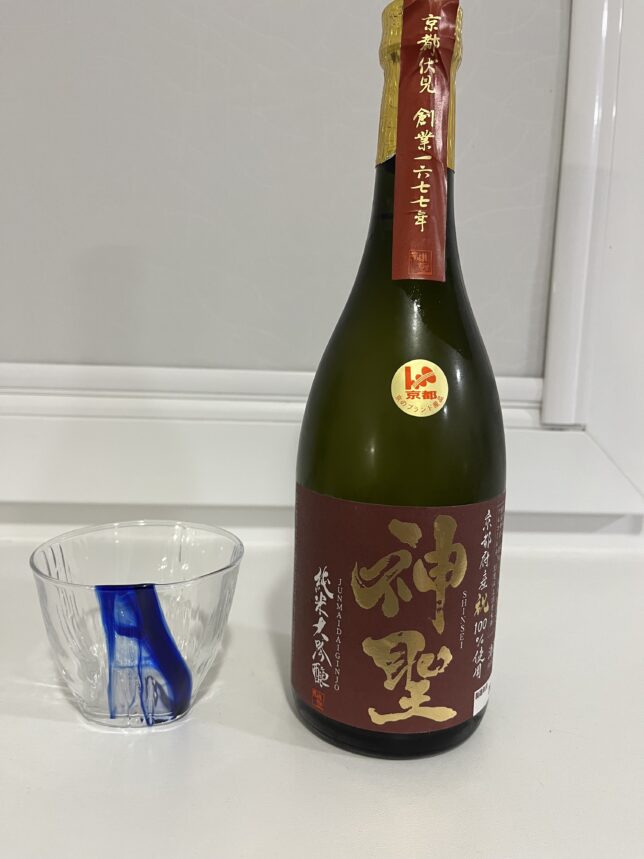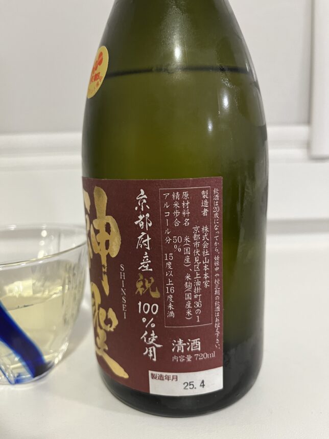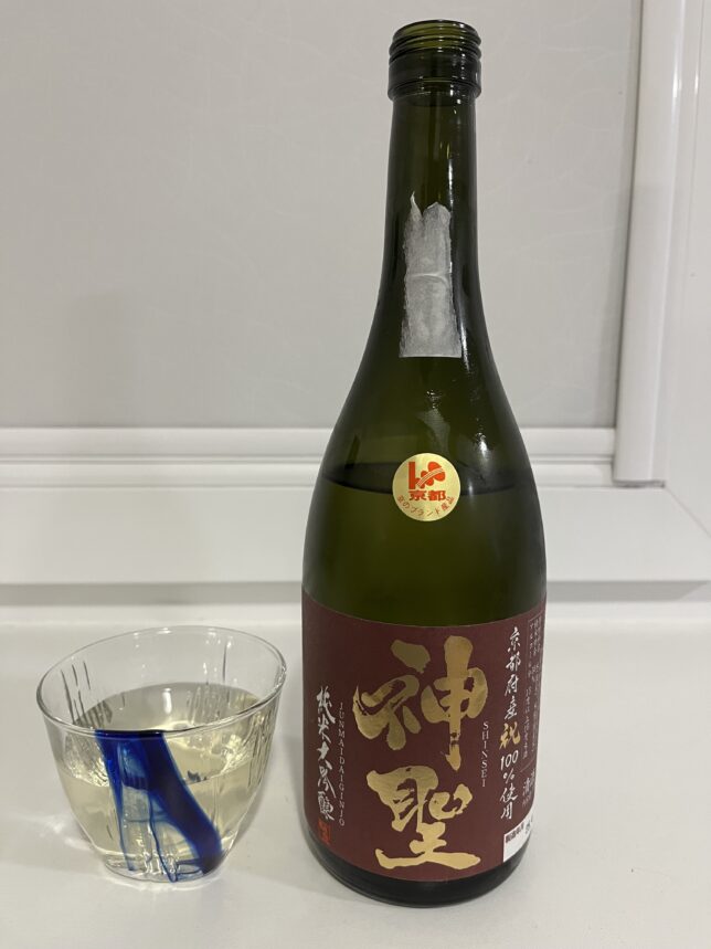 今回は純米大吟醸 「神聖」です。口当たりは柔らかでクリアな感じ、後口はスッキリしています。香りもフルーティーでさすが純米大吟醸でしょうか。ラベルを見ると精米歩合 50%、アルコール度数15-16度未満とあまり詳しくは書かれてはいません。山本本家が手掛けており、場所は「京都市伏見区上油掛町36-1」にあります。